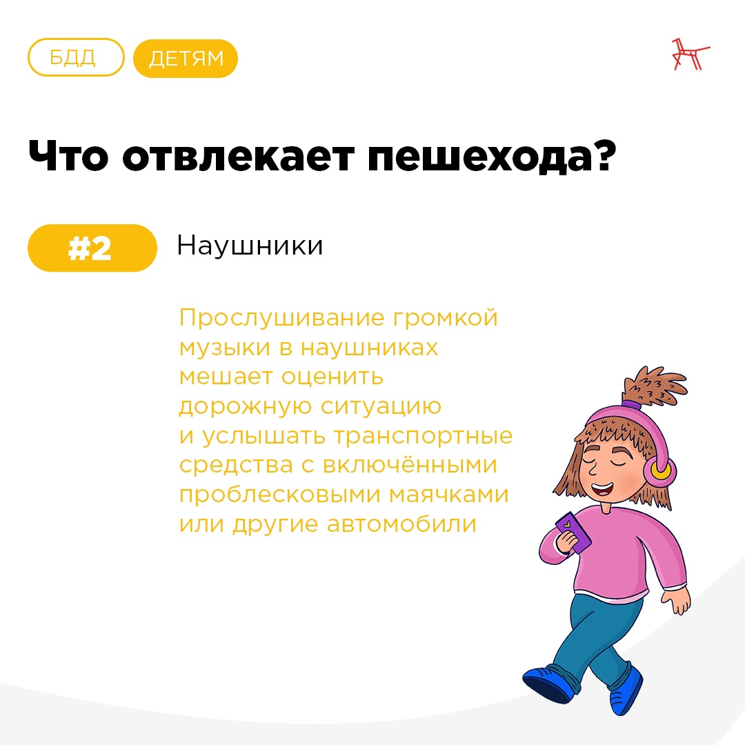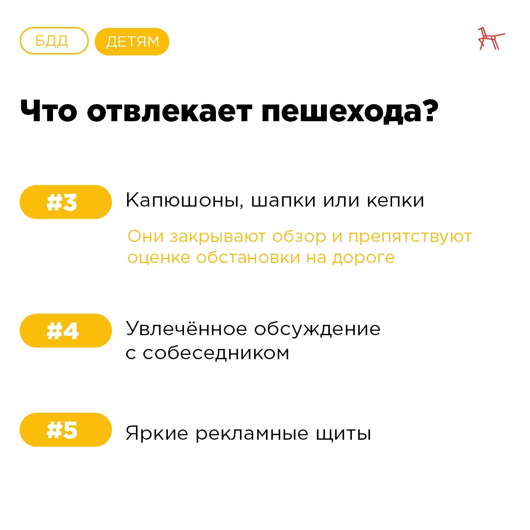 Чтобы пешеходу оставаться в безопасности нужно оставаться внимательным вблизи проезжей части дороги и при её переходе. Центр по профилактике ДДТТ Института воспитания подготовил карточки, где собраны основные факторы, отвлекающие внимание пешеходов.