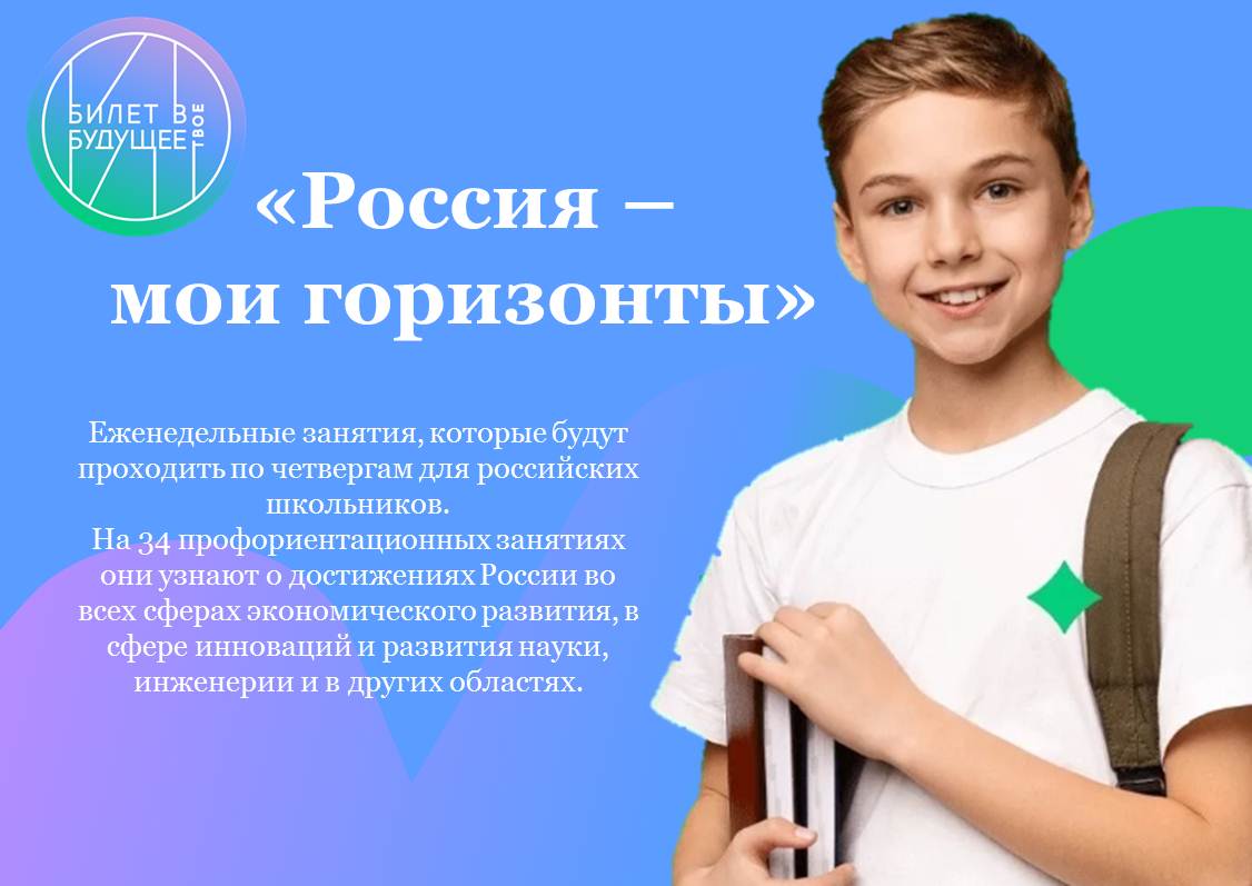 «Россия – мои горизонты» – еженедельные занятия, которые будут проходить по четвергам для российских школьников. На 34 профориентационных занятиях они узнают о достижениях России во всех сферах экономического развития (в промышленности, в сельском хозяйстве, в информационных технологиях), в сфере инноваций и развития науки, инженерии и в других областях. На курсе дети не только впервые услышат впечатляющие цифры и факты о нашей стране, рекордные значения, лидирующие показатели России в мире и необычные факты, но и попробуют себя в роли разных специалистов этих сфер на моделирующих профпробах. Также учащиеся получат подробнейшую информацию о современном рынке труда, о перспективных профессиях и специальностях, о тех навыках, освоение которых поможет им стать востребованными специалистами.