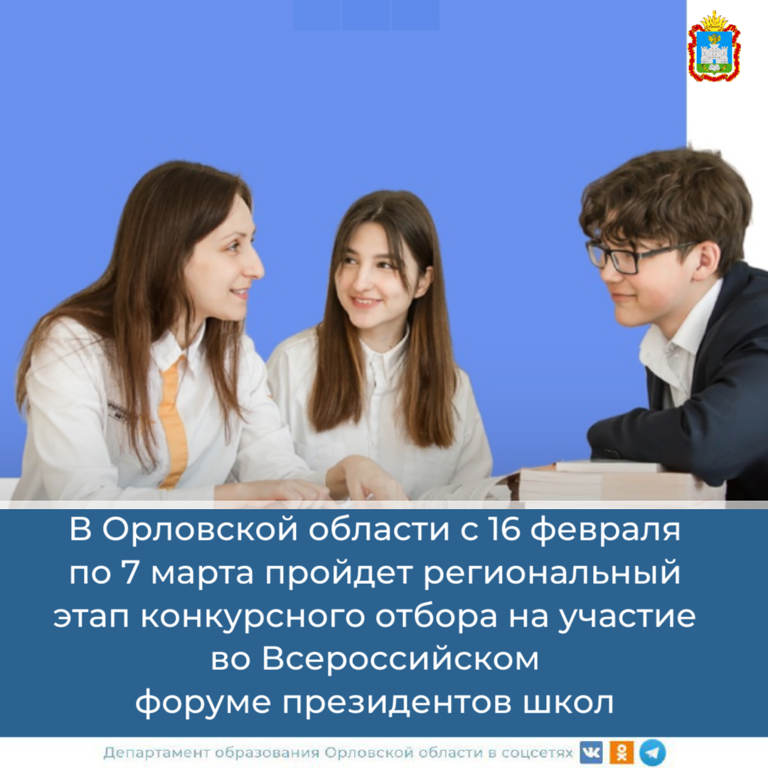 В Орловской области с 16 февраля по 7 марта пройдет региональный этап конкурсного отбора на участие во Всероссийском форуме президентов школ, который пройдет с 25 по 28 марта