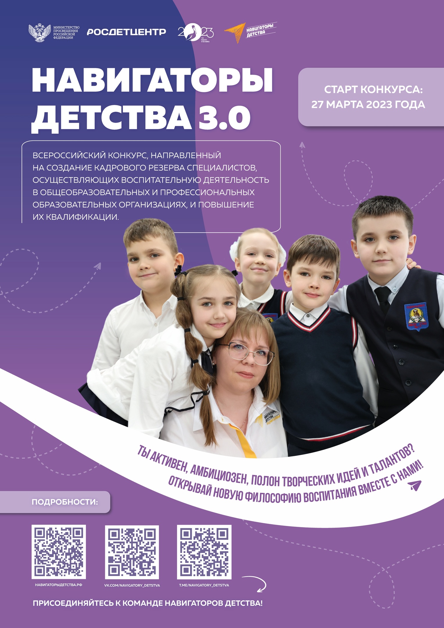 27 марта 2023 года стартовал Всероссийский конкурс «Навигаторы детства 3.0», направленный на формирование кадрового резерва на должность советника директора по воспитанию.