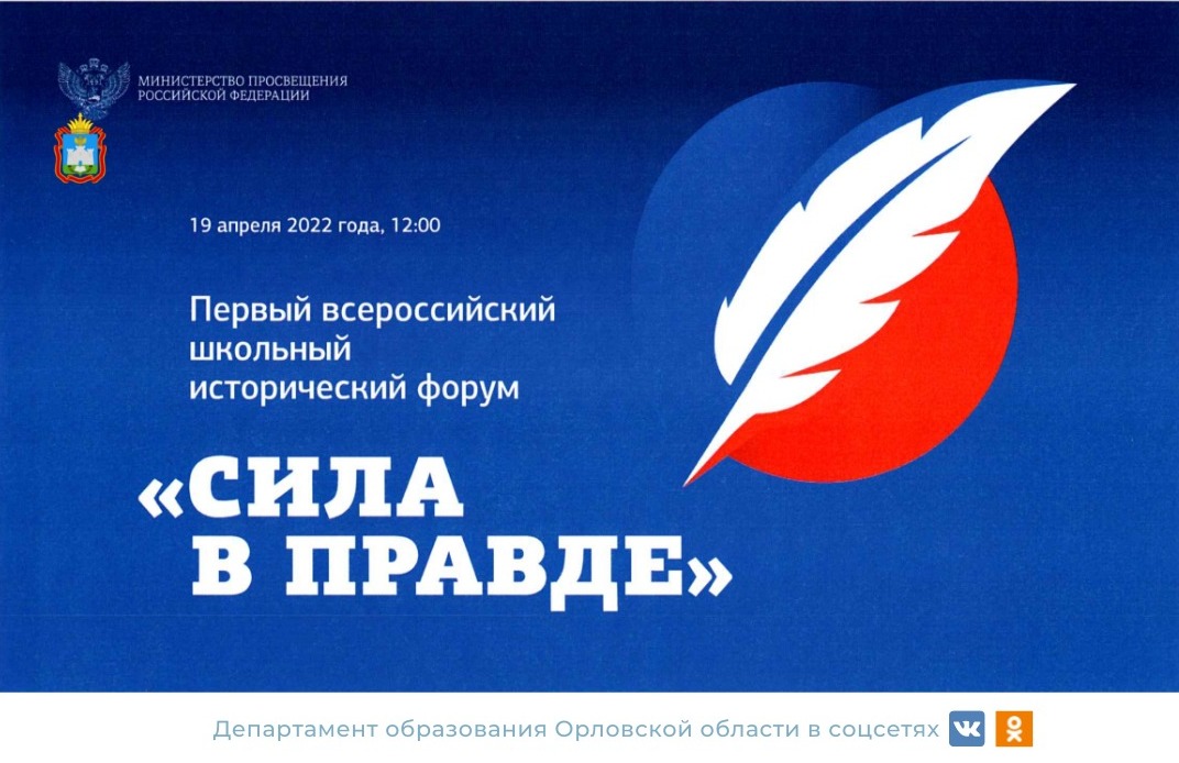 Министерством просвещения Российской Федерации инициировано проведение Первого Всероссийского школьного исторического форума «Сила в правде» (далее – Форум) 18–20 апреля 2022 года в городе Москве.