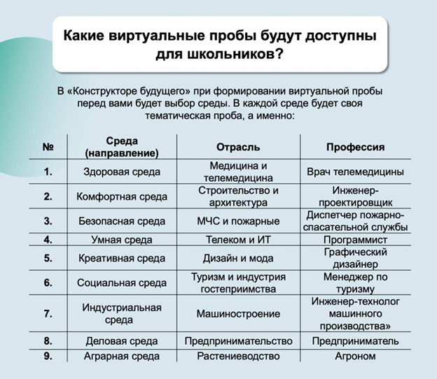 Для прохождения доступно 9 профпроб в соответствии с тематическими направлениями проекта (средами): врач телемедицины, менеджер по туризму, предприниматель, инженер-технолог машинного производства, агроном, графический дизайнер, инженер-проектировщик, диспетчер пожарно-спасательной службы, программист.