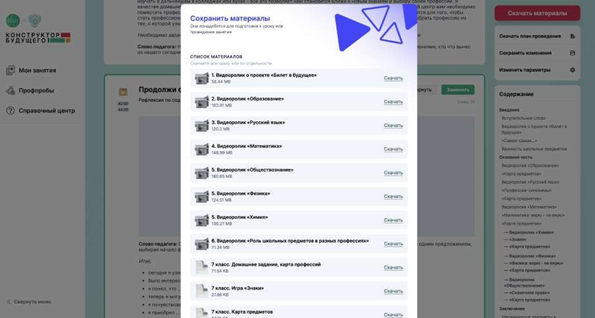 После того, как учитель выбрал наиболее подходящие блоки, ему остаётся только скачать мультимедийные материалы и полноценный сценарный план урока, включающий в себя всё от приветственных слов до домашнего задания.